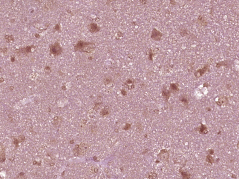 Paraformaldehyde-fixed, paraffin embedded (human brain glioma); Antigen retrieval by boiling in sodium citrate buffer (pH6.0) for 15min; Block endogenous peroxidase by 3% hydrogen peroxide for 20 minutes; Blocking buffer (normal goat serum) at 37°C for 30min; Antibody incubation with (RANBP3L) Polyclonal Antibody, Unconjugated (bs-21154R) at 1:400 overnight at 4°C, followed by operating according to SP Kit(Rabbit) (sp-0023) instructionsand DAB staining.