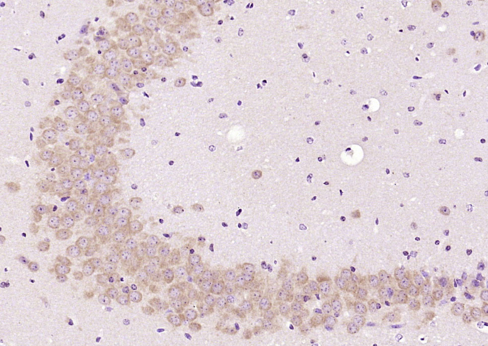 Paraformaldehyde-fixed, paraffin embedded (mouse brain); Antigen retrieval by boiling in sodium citrate buffer (pH6.0) for 15min; Block endogenous peroxidase by 3% hydrogen peroxide for 20 minutes; Blocking buffer (normal goat serum) at 37°C for 30min; Antibody incubation with (PKC delta ) Polyclonal Antibody, Unconjugated (bs-20593R) at 1:200 overnight at 4°C, followed by operating according to SP Kit(Rabbit) (sp-0023) instructionsand DAB staining.