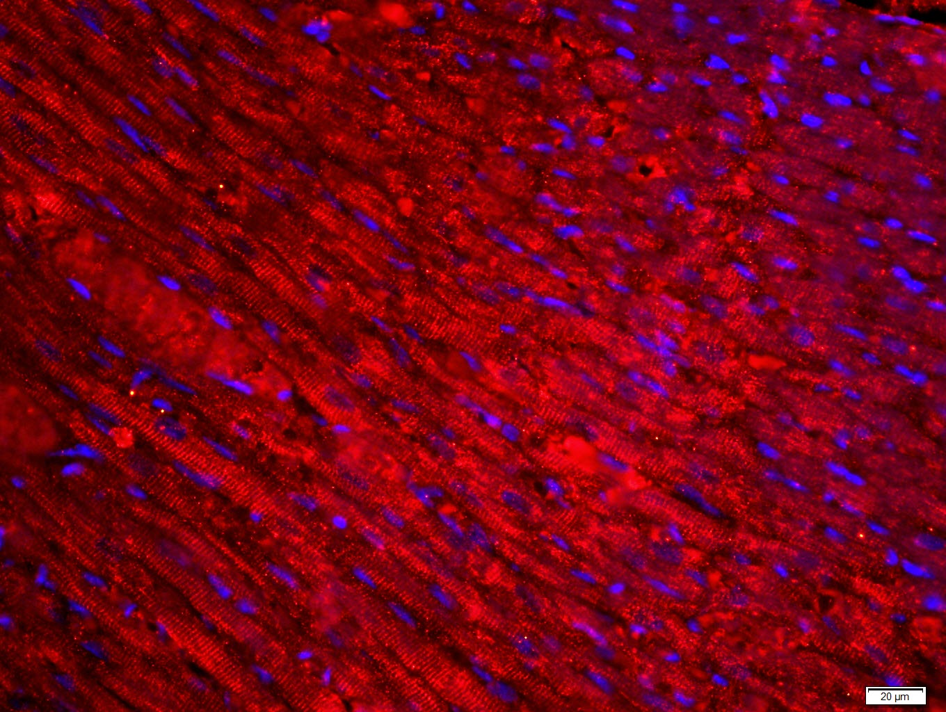 Paraformaldehyde-fixed, paraffin embedded (Rat heart); Antigen retrieval by boiling in sodium citrate buffer (pH6.0) for 15min; Block endogenous peroxidase by 3% hydrogen peroxide for 20 minutes; Blocking buffer (normal goat serum) at 37°C for 30min; Antibody incubation with (Desmin; DES) Polyclonal Antibody, Unconjugated (bs-20702R) at 1:400 overnight at 4°C, followed by a conjugated secondary antibody (bs-0295G-cy3) for 90 minutes and DAPI for nuclei staining.