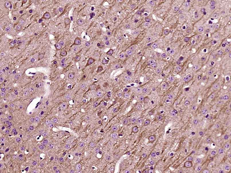 Paraformaldehyde-fixed, paraffin embedded (Mouse brain); Antigen retrieval by boiling in sodium citrate buffer (pH6.0) for 15min; Block endogenous peroxidase by 3% hydrogen peroxide for 20 minutes; Blocking buffer (normal goat serum) at 37°C for 30min; Antibody incubation with (UCP-2) Polyclonal Antibody, Unconjugated (bs-20750R) at 1:400 overnight at 4°C, followed by operating according to SP Kit(Rabbit) (sp-0023) instructionsand DAB staining.