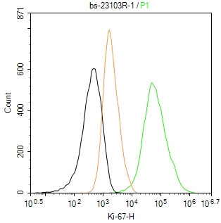 The HepG2 (H) cells were fixed with 4% PFA (10 min at r.t.) and then permeabilized with 90% ice-cold methanol for 20 min at -20℃,the cells then were incubated in 5%BSA to block non-specific protein-protein interactions (30 min at r.t.), followed by secondary antibody incubation for 40 min at room temperature. Primary Antibody (green):Rabbit Anti-Ki-67 antibody (bs-23103R,1:100); Isotype Control (orange): Rabbit IgG (bs-0295P). Blank control (black): PBS. Acquisition of 20,000 events was performed.