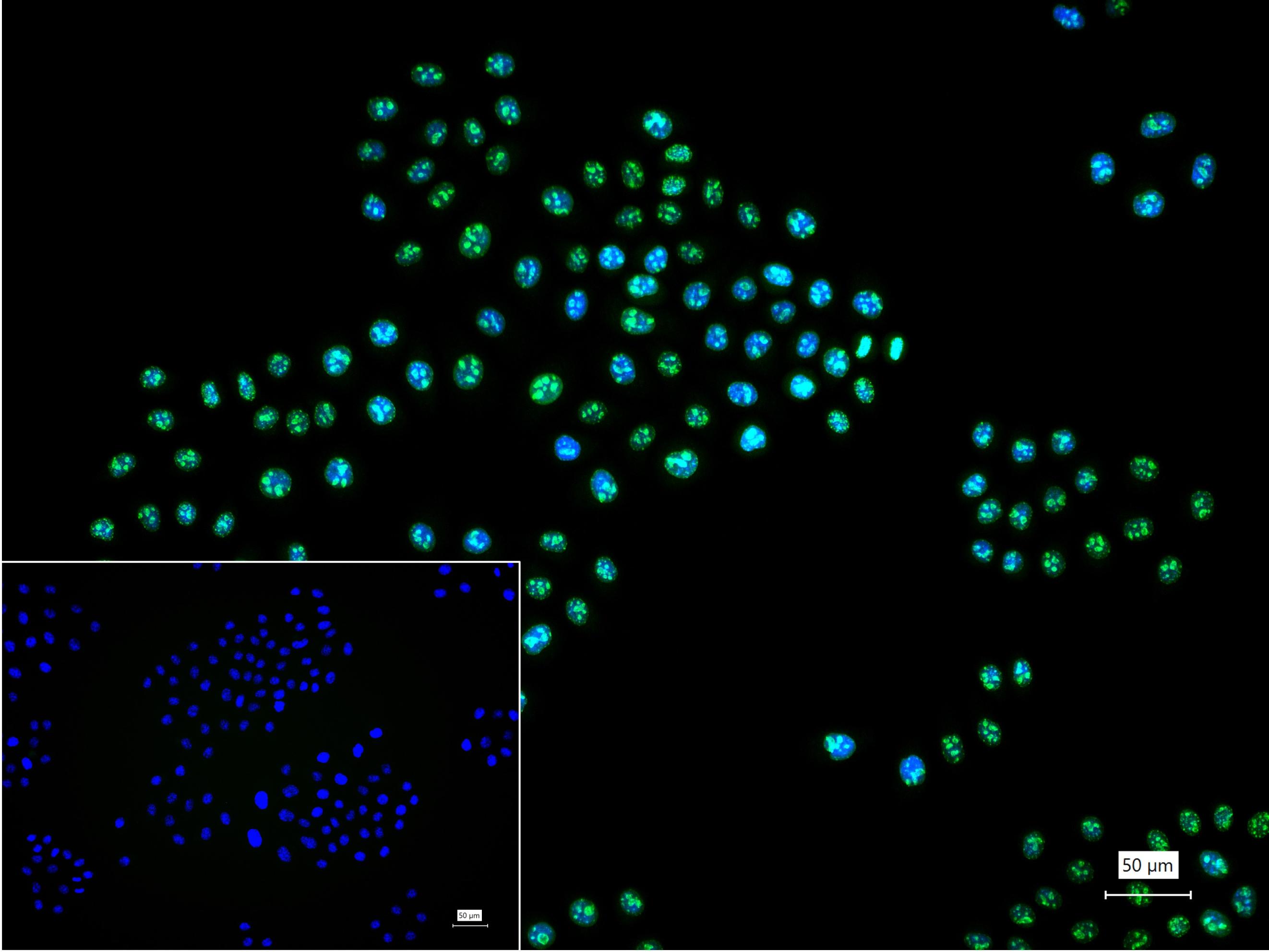 4% Paraformaldehyde-fixed Hela (H) cell; Triton X-100 at r.t. for 20 min; Antibody incubation with (Ki-67) polyclonal Antibody, unconjugated (bs-23103R) 1:100, 90 min at 37°C; followed by conjugated Goat Anti-Rabbit IgG antibody (green, bs-60295G-BF488) at 37°C for 90 min, DAPI (blue, C02-04002) was used to stain the cell nuclei. PBS instead of the primary antibody was used as the blank control.