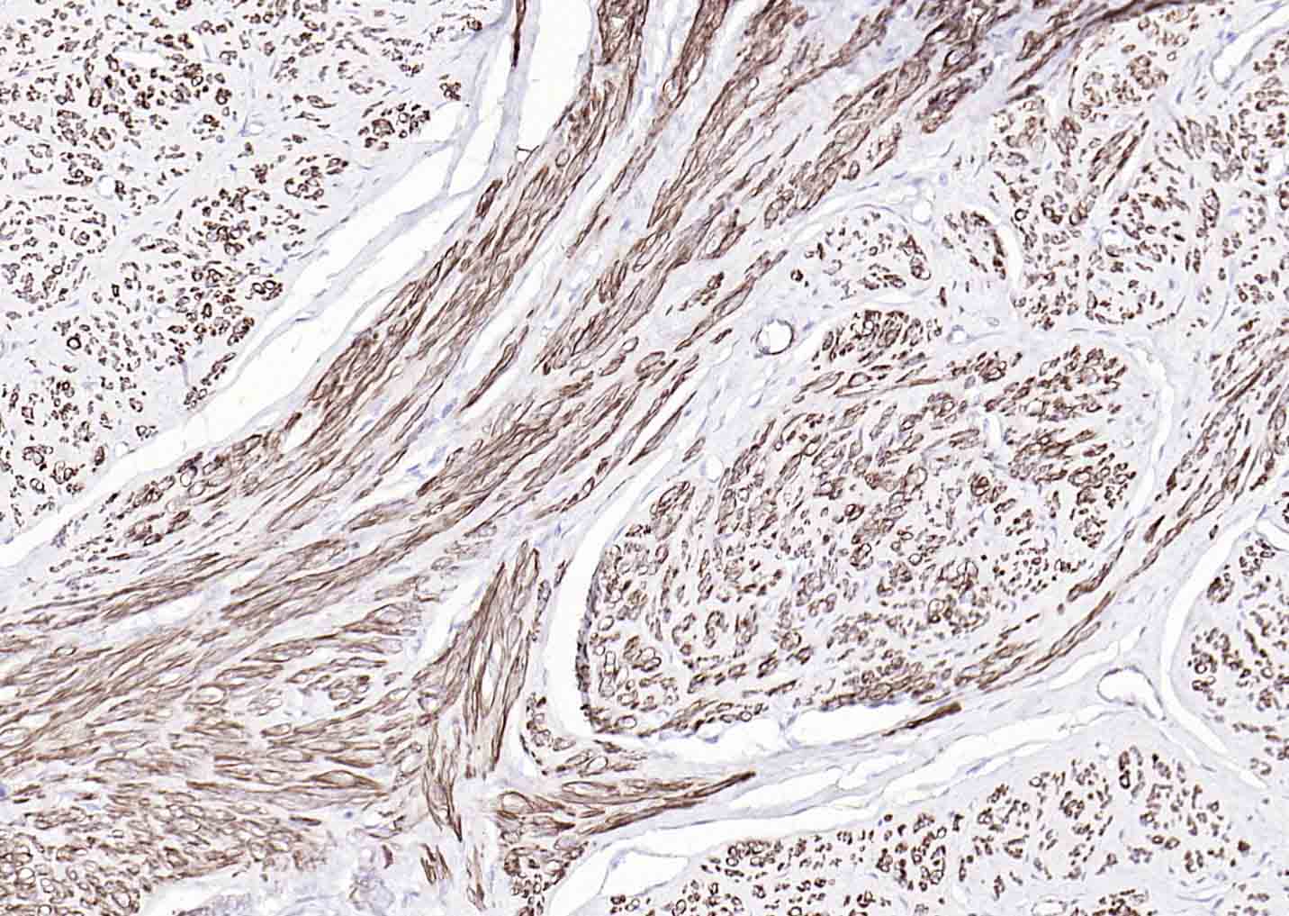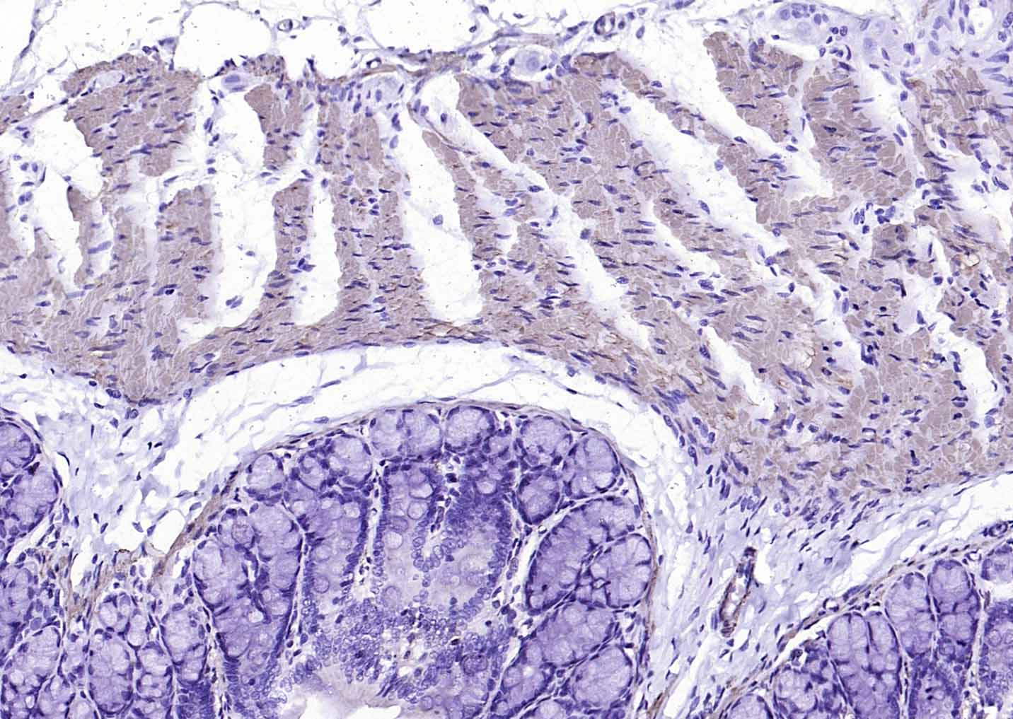 Paraformaldehyde-fixed, paraffin embedded (rat stomach); Antigen retrieval by boiling in sodium citrate buffer (pH6.0) for 15min; Block endogenous peroxidase by 3% hydrogen peroxide for 20 minutes; Blocking buffer (normal goat serum) at 37°C for 30min; Antibody incubation with (alpha smooth muscle Actin) Monoclonal Antibody, Unconjugated (bsm-33187M) at 1:200 overnight at 4°C, followed by operating according to SP Kit(Mouse)(sp-0024) instructionsand DAB staining.