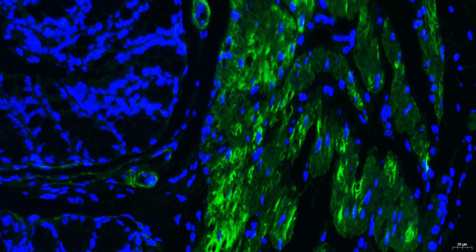 Paraformaldehyde-fixed, paraffin embedded Mouse Stomach; Antigen retrieval by boiling in sodium citrate buffer (pH6.0) for 15 min; Antibody incubation with alpha smooth muscle Actin Monoclonal Antibody, Unconjugated (bsm-33187M) at 1:200 overnight at 4°C. Followed by conjugated Goat Anti-Mouse IgG antibody (green, bs-0296G-BF488), DAPI (blue, C02-04002) was used to stain the cell nuclei.