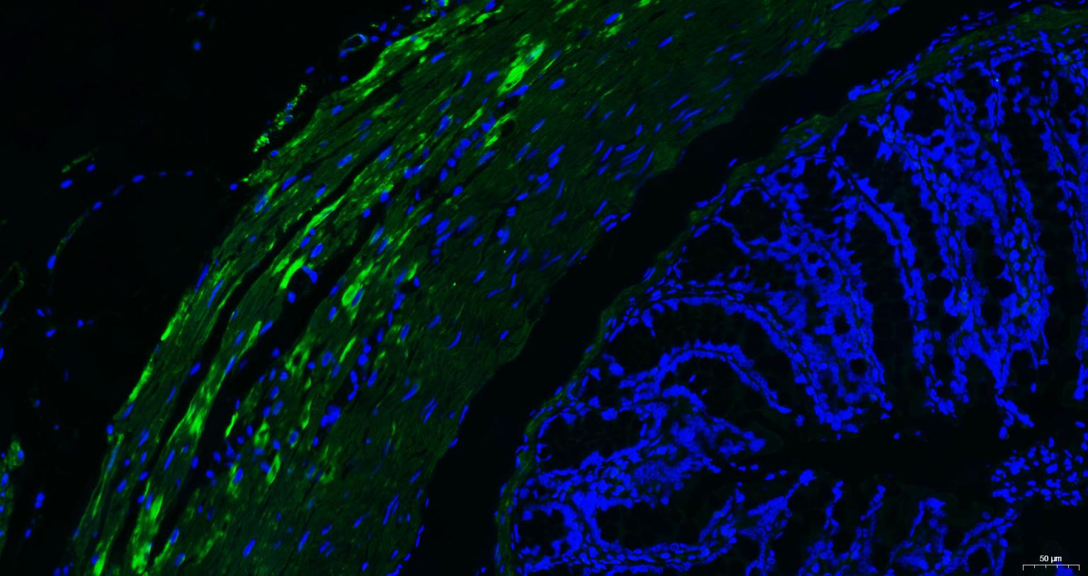 Paraformaldehyde-fixed, paraffin embedded Mouse colon; Antigen retrieval by boiling in sodium citrate buffer (pH6.0) for 15 min; Antibody incubation with alpha smooth muscle Actin Monoclonal Antibody, Unconjugated (bsm-33187M) at 1:200 overnight at 4°C. Followed by conjugated Goat Anti-Mouse IgG antibody (green, bs-0296G-BF488), DAPI (blue, C02-04002) was used to stain the cell nuclei.