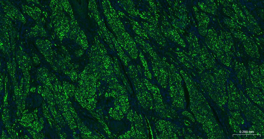Paraformaldehyde-fixed, paraffin embedded Human Uterus; Antigen retrieval by boiling in sodium citrate buffer (pH6.0) for 15 min; The section was incubated with Desmin Monoclonal Antibody, Unconjugated (bsm-33229M) at 1:200 overnight at 4°C. Followed by conjugated Goat Anti-Mouse IgG antibody (green, bs-0296G-BF488), DAPI (blue, C02-04002) was used to stain the cell nuclei.