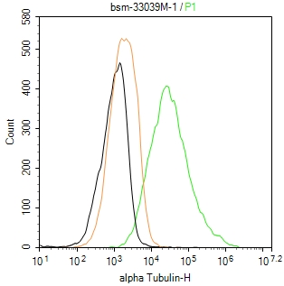 The HepG2 (H) cells were fixed with 4% PFA (10 min at r.t.) and then permeabilized with 90% ice-cold methanol for 20 min at -20℃,the cells then were incubated in 5%BSA to block non-specific protein-protein interactions (30 min at r.t.), followed by secondary antibody incubation for 40 min at room temperature. Primary Antibody (green):Mouse Anti-alpha Tubulin antibody (bsm-33039M,1:100); Isotype Control (orange): Mouse IgG (bs-0296P). Blank control (black): PBS. Acquisition of 20,000 events was performed.