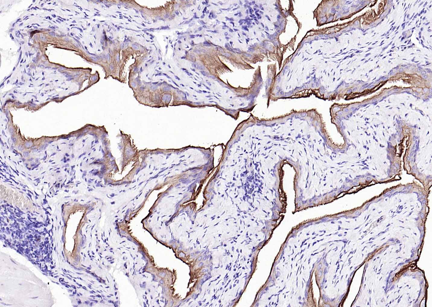 Paraformaldehyde-fixed, paraffin embedded (human uterus); Antigen retrieval by boiling in sodium citrate buffer (pH6.0) for 15min; Block endogenous peroxidase by 3% hydrogen peroxide for 20 minutes; Blocking buffer (normal goat serum) at 37°C for 30min; Antibody incubation with (CK7) Monoclonal Antibody, Unconjugated (bsm-33060M) at 1:200 overnight at 4°C, followed by operating according to SP Kit(Mouse)(sp-0024) instructionsand DAB staining.