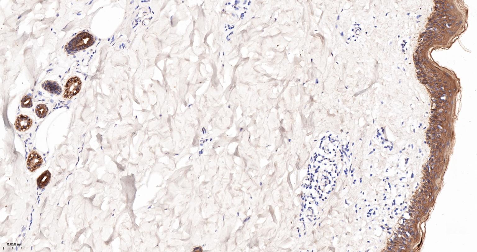Paraformaldehyde-fixed, paraffin embedded (rat skin); Antigen retrieval by boiling in sodium citrate buffer (pH6.0) for 15min; Block endogenous peroxidase by 3% hydrogen peroxide for 20 minutes; Blocking buffer (normal goat serum) at 37°C for 30min; Antibody incubation with (CK16) Monoclonal Antibody, Unconjugated (ascites of bsm-33062M 8H6) at 1:2000 overnight at 4°C, followed by operating according to SP Kit(Mouse) (sp-0024) instructions and DAB staining.