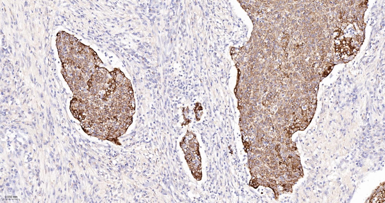 Paraformaldehyde-fixed, paraffin embedded (human cervical carcinoma); Antigen retrieval by boiling in sodium citrate buffer (pH6.0) for 15min; Block endogenous peroxidase by 3% hydrogen peroxide for 20 minutes; Blocking buffer (normal goat serum) at 37°C for 30min; Antibody incubation with (CK16) Monoclonal Antibody, Unconjugated (ascites of bsm-33062M 8H6) at 1:2000 overnight at 4°C, followed by operating according to SP Kit(Mouse) (sp-0024) instructions and DAB staining.
