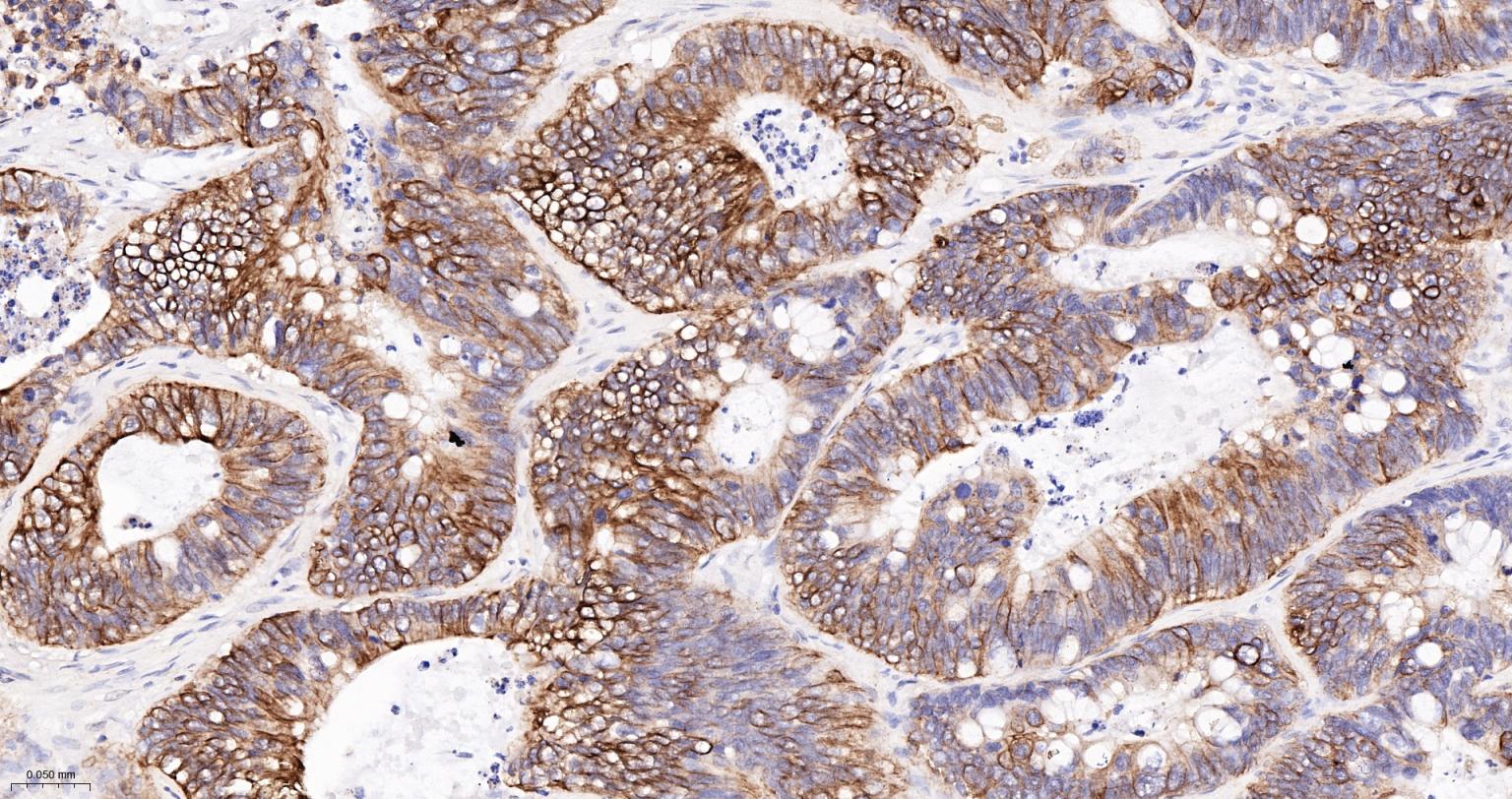 Paraformaldehyde-fixed, paraffin embedded (human colon carcinoma); Antigen retrieval by boiling in sodium citrate buffer (pH6.0) for 15min; Block endogenous peroxidase by 3% hydrogen peroxide for 20 minutes; Blocking buffer (normal goat serum) at 37°C for 30min; Antibody incubation with (CK16) Monoclonal Antibody, Unconjugated (ascites of bsm-33062M 8H6) at 1:2000 overnight at 4°C, followed by operating according to SP Kit(Mouse) (sp-0024) instructions and DAB staining.