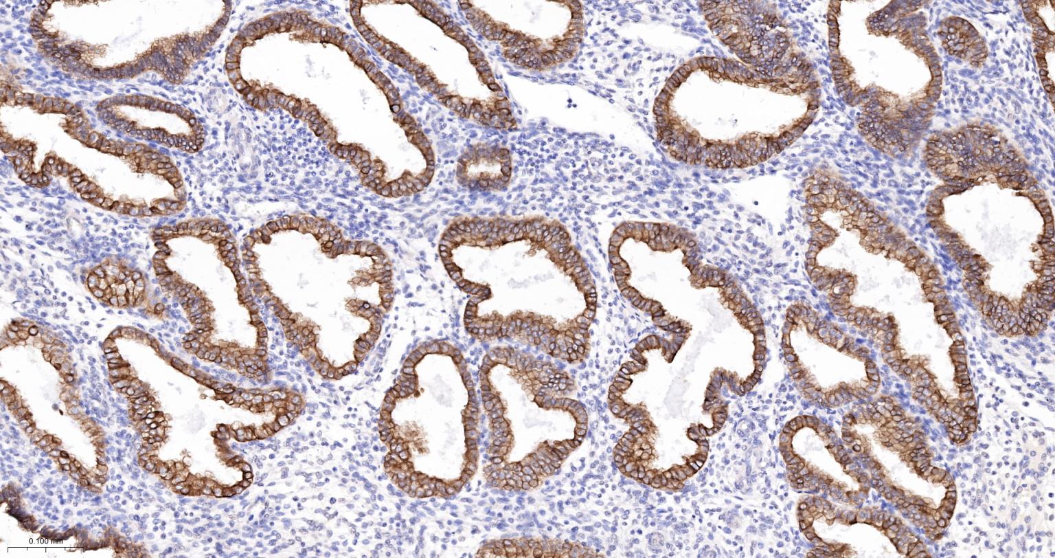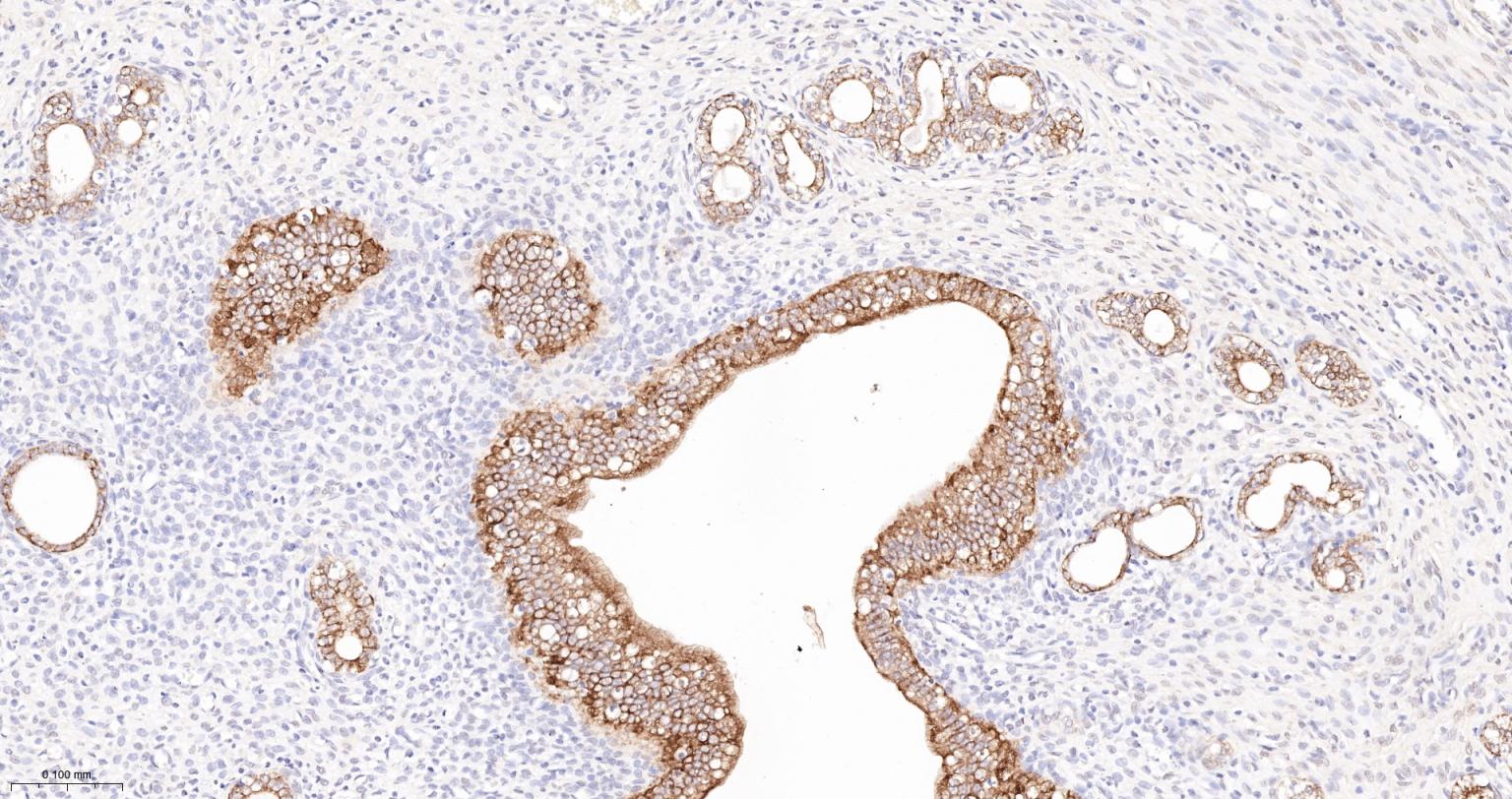 Paraformaldehyde-fixed, paraffin embedded (rat uterus); Antigen retrieval by boiling in sodium citrate buffer (pH6.0) for 15min; Block endogenous peroxidase by 3% hydrogen peroxide for 20 minutes; Blocking buffer (normal goat serum) at 37°C for 30min; Antibody incubation with (CK16) Monoclonal Antibody, Unconjugated (ascites of bsm-33062M 8H6) at 1:2000 overnight at 4°C, followed by operating according to SP Kit(Mouse) (sp-0024) instructions and DAB staining.