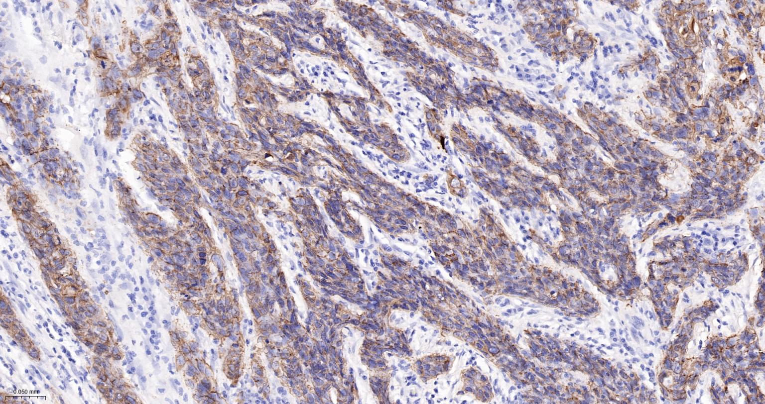 Paraformaldehyde-fixed, paraffin embedded (human skin cancer); Antigen retrieval by boiling in sodium citrate buffer (pH6.0) for 15min; Block endogenous peroxidase by 3% hydrogen peroxide for 20 minutes; Blocking buffer (normal goat serum) at 37°C for 30min; Antibody incubation with (CK16) Monoclonal Antibody, Unconjugated (ascites of bsm-33062M 8H6) at 1:2000 overnight at 4°C, followed by operating according to SP Kit(Mouse) (sp-0024) instructions and DAB staining.