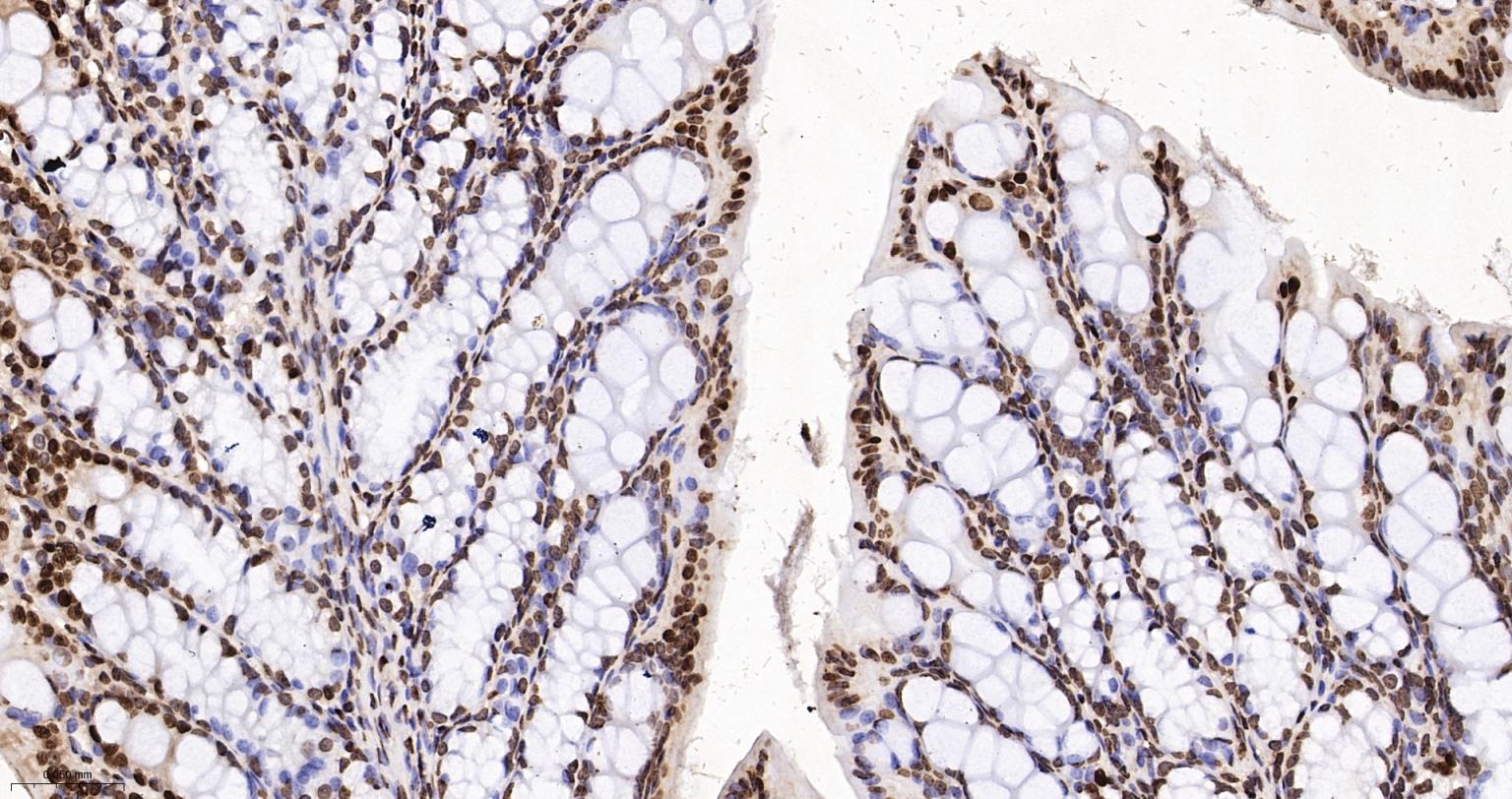 Paraformaldehyde-fixed, paraffin embedded (rat colon); Antigen retrieval by boiling in sodium citrate buffer (pH6.0) for 15min; Block endogenous peroxidase by 3% hydrogen peroxide for 20 minutes; Blocking buffer (normal goat serum) at 37°C for 30min; Antibody incubation with (Histone H3) Monoclonal Antibody, Unconjugated (ascites of bsm-33104M 3D6) at 1:2000 overnight at 4°C, followed by operating according to SP Kit(Mouse) (sp-0024) instructions and DAB staining.