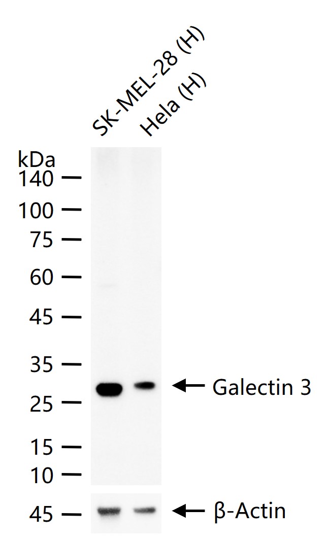 25 ug total protein per lane of various lysates (see on figure) probed with Galectin 3 monoclonal antibody, unconjugated (bsm-33049M) at 1:1000 dilution and 4°C overnight incubation. Followed by conjugated secondary antibody incubation at r.t. for 60 min.