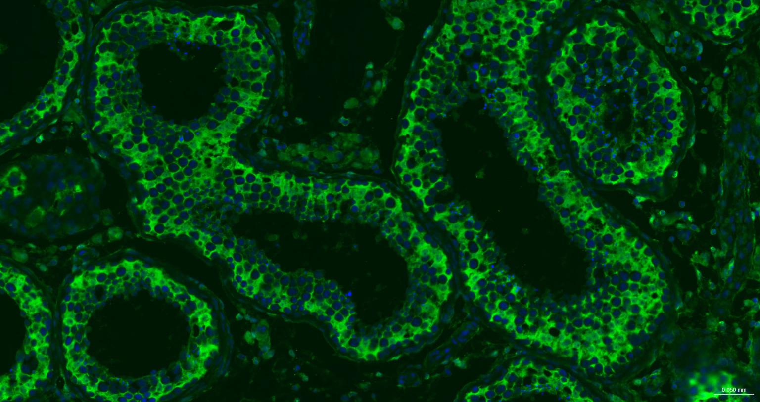 Paraformaldehyde-fixed, paraffin embedded Human Testicles; Antigen retrieval by boiling in sodium citrate buffer (pH6.0) for 15 min; The section was incubated with Galectin 3 Monoclonal Antibody, Unconjugated (bsm-33248M) at 1:200 overnight at 4°C. Followed by conjugated Goat Anti-Mouse IgG antibody (Green, bs-0296G-BF488), DAPI (blue, C02-04002) was used to stain the cell nuclei.