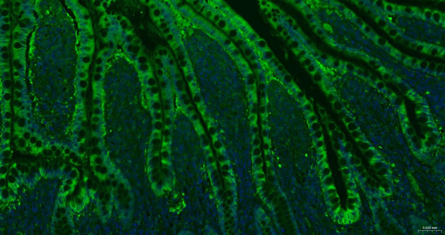 Paraformaldehyde-fixed, paraffin embedded Human Small Intestine; Antigen retrieval by boiling in sodium citrate buffer (pH6.0) for 15 min; The section was incubated with Galectin 3 Monoclonal Antibody, Unconjugated (bsm-33248M) at 1:200 overnight at 4°C. Followed by conjugated Goat Anti-Mouse IgG antibody (Green, bs-0296G-BF488), DAPI (blue, C02-04002) was used to stain the cell nuclei.