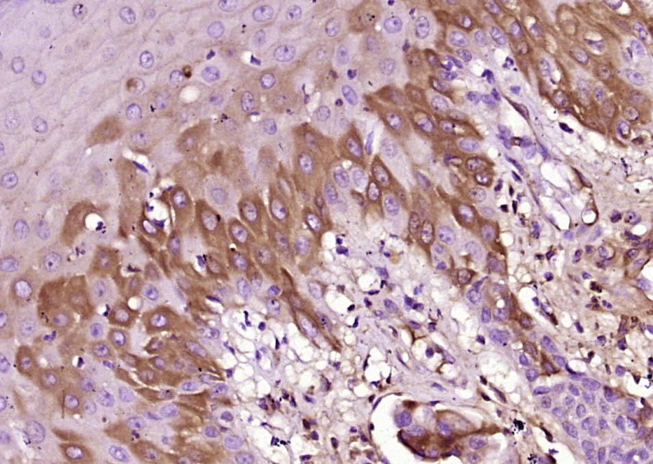 Paraformaldehyde-fixed, paraffin embedded (human skin cancer); Antigen retrieval by boiling in sodium citrate buffer (pH6.0) for 15min; Block endogenous peroxidase by 3% hydrogen peroxide for 20 minutes; Blocking buffer (normal goat serum) at 37°C for 30min; Antibody incubation with (Transferrin) Monoclonal Antibody, Unconjugated (bsm-33243M) at 1:400 overnight at 4°C, followed by operating according to SP Kit(Mouse)(sp-0024) instructionsand DAB staining.