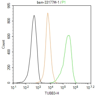 The U-87MG (H) cells were fixed with 4% PFA (10 min at r.t.) and then permeabilized with 90% ice-cold methanol for 20 min at -20℃,the cells then were incubated in 5%BSA to block non-specific protein-protein interactions (30 min at r.t.), followed by secondary antibody incubation for 40 min at room temperature. Primary Antibody (green):Mouse Anti-TUBB3 antibody (bsm-33177M): 1 μg/10^6 cells; Isotype Control (orange): Mouse IgG (bs-0296P). Blank control (black): PBS. Acquisition of 20,000 events was performed.