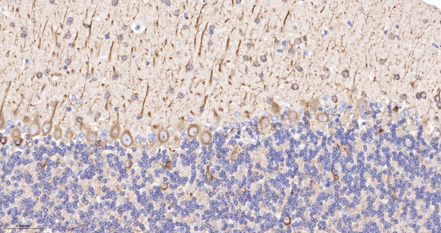 Paraformaldehyde-fixed, paraffin embedded (rat cerebellum); Antigen retrieval by boiling in sodium citrate buffer (pH6.0) for 15min; Block endogenous peroxidase by 3% hydrogen peroxide for 20 minutes; Blocking buffer (normal goat serum) at 37°C for 30min; Incubation with (TUBB3 (Neuronal Marker) ) Monoclonal Antibody, Unconjugated (bsm-33177M) at 1:200 overnight at 4°C, followed by operating according to SP Kit(Mouse)(sp-0024) instructionsand DAB staining.