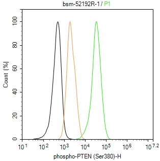 The Hela (H) cells were fixed with 4% PFA (10 min at r.t.) and then permeabilized with 90% ice-cold methanol for 20 min at -20℃,the cells then were incubated in 5%BSA to block non-specific protein-protein interactions (30 min at r.t.), followed by secondary antibody incubation for 40 min at room temperature. Primary Antibody (green):Rabbit Anti-phospho-PTEN (Ser380) antibody (bsm-52192R): 1 μg/10^6 cells; Isotype Control (orange): Rabbit IgG (bs-0295P). Blank control (black): PBS. Acquisition of 20,000 events was performed.