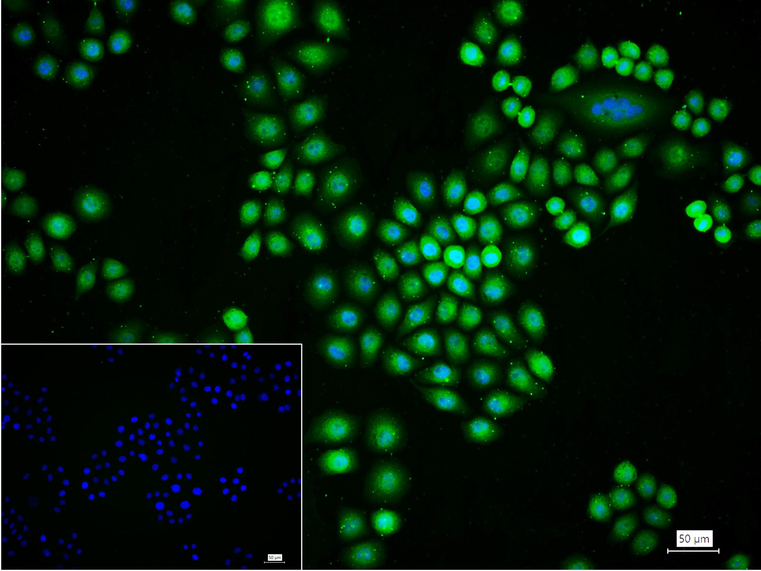 4% Paraformaldehyde-fixed Hela (H) cell; Triton X-100 at r.t. for 20 min; Antibody incubation with (phospho-PTEN (Ser380)) monoclonal Antibody, unconjugated (bsm-52192R) 1:100, 90 min at 37°C; followed by conjugated Goat Anti-Rabbit IgG antibody (green, bs-60295G-BF488) at 37°C for 90 min, DAPI (blue, C02-04002) was used to stain the cell nuclei. PBS instead of the primary antibody was used as the blank control.