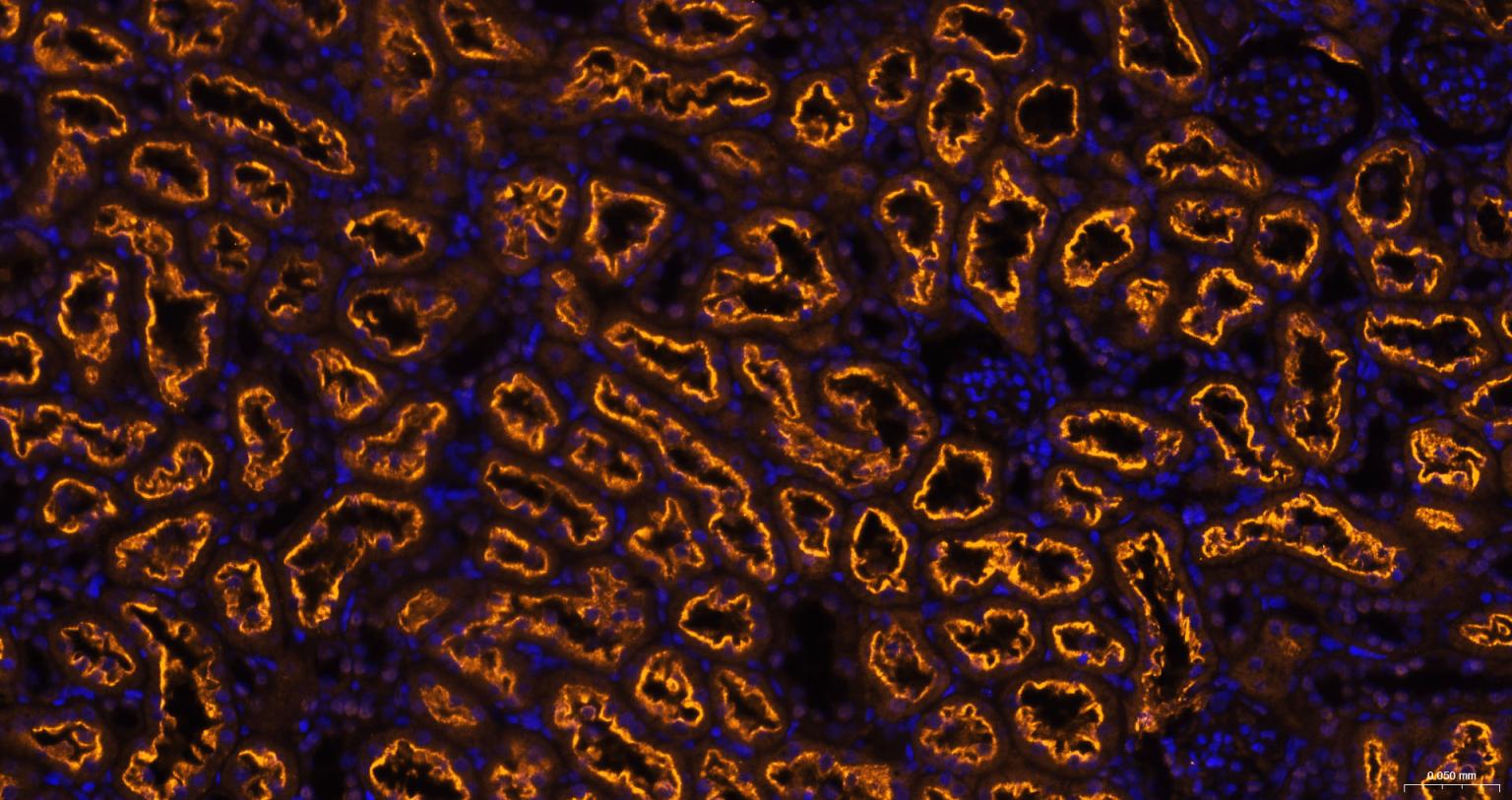 Paraformaldehyde-fixed, paraffin embedded rat kidney; Antigen retrieval by boiling in sodium citrate buffer (pH6.0) for 15 min; incubation with LRP2 antibody, Unconjugated(bsm-42103R) at 1:200 overnight at 4°C. Incubation with bs-0295G-Bio(Goat Anti-Rabbit IgG H&L, Biotin conjugated), followed by binding with bs-0437P-BF555(orange) , DAPI (blue, C02-04002) was used to stain the cell nuclei.