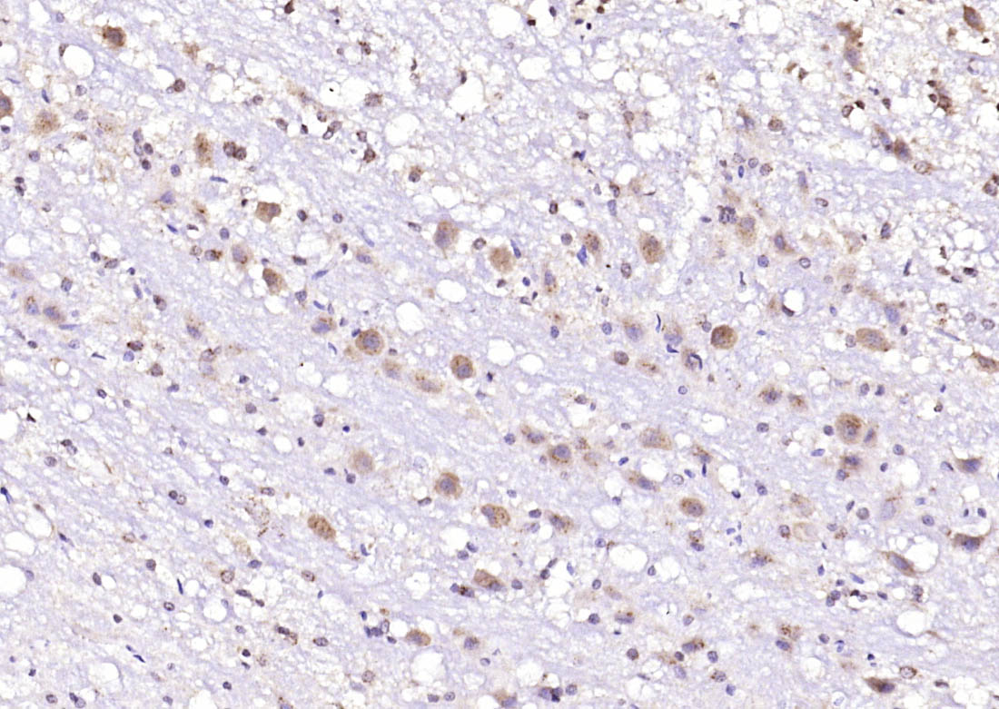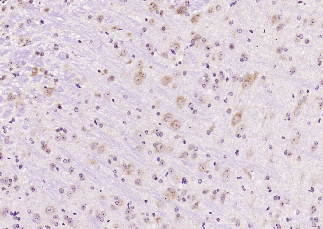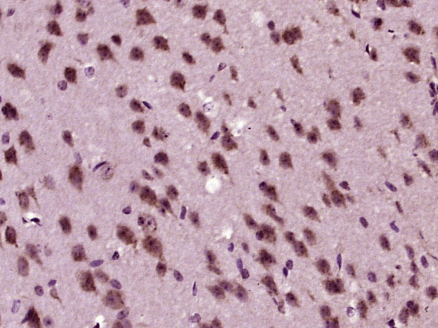 Paraformaldehyde-fixed, paraffin embedded (mouse brain tissue); Antigen retrieval by boiling in sodium citrate buffer (pH6.0) for 15min; Block endogenous peroxidase by 3% hydrogen peroxide for 20 minutes; Blocking buffer (normal goat serum) at 37°C for 30min; Antibody incubation with (PKC delta) Polyclonal Antibody, Unconjugated (bs-23440R) at 1:400 overnight at 4°C, followed by operating according to SP Kit(Rabbit) (sp-0023) instructionsand DAB staining.