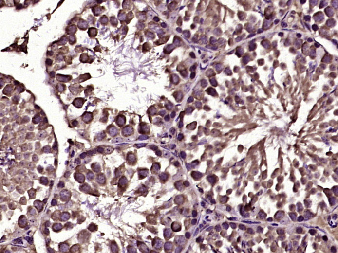 Paraformaldehyde-fixed, paraffin embedded (Mouse testis); Antigen retrieval by boiling in sodium citrate buffer (pH6.0) for 15min; Block endogenous peroxidase by 3% hydrogen peroxide for 20 minutes; Blocking buffer (normal goat serum) at 37°C for 30min; Antibody incubation with (AMPK gamma 1) Polyclonal Antibody, Unconjugated (bs-23404R) at 1:400 overnight at 4°C, followed by operating according to SP Kit(Rabbit) (sp-0023) instructions and DAB staining.