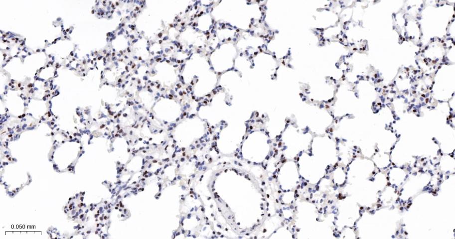 Paraformaldehyde-fixed, paraffin embedded Mouse Lung; Antigen retrieval by boiling in sodium citrate buffer (pH6.0) for 15 min; Antibody incubation with phospho-STAT3 (Ser727) Monoclonal Antibody, Unconjugated(bsm-52210R) at 1:200 overnight at 4°C, followed by conjugation to the bs-0295G-HRP and DAB (C-0010) staining.