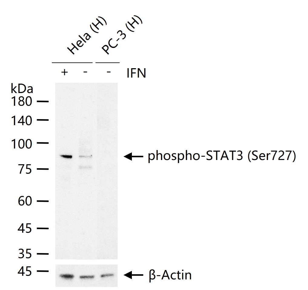 Hela (H) cells were treated with or without IFN (50 ng/ml) for 30 min, 25 μg total protein per lane of cell lysates (see on figure) probed with phospho-STAT3 (Ser727) monoclonal antibody, unconjugated (bsm-52210R) at 1:1000 dilution and 4°C overnight incubation. Followed by conjugated secondary antibody incubation at r.t. for 60 min.