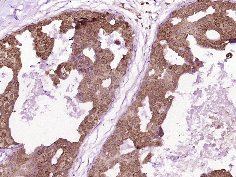 Paraformaldehyde-fixed, paraffin embedded (Human breast carcinoma); Antigen retrieval by boiling in sodium citrate buffer (pH6.0) for 15min; Block endogenous peroxidase by 3% hydrogen peroxide for 20 minutes; Blocking buffer (normal goat serum) at 37°C for 30min; Antibody incubation with (ST2) Polyclonal Antibody, Unconjugated (bs-23758R) at 1:400 overnight at 4°C, followed by operating according to SP Kit(Rabbit) (sp-0023) instructionsand DAB staining.