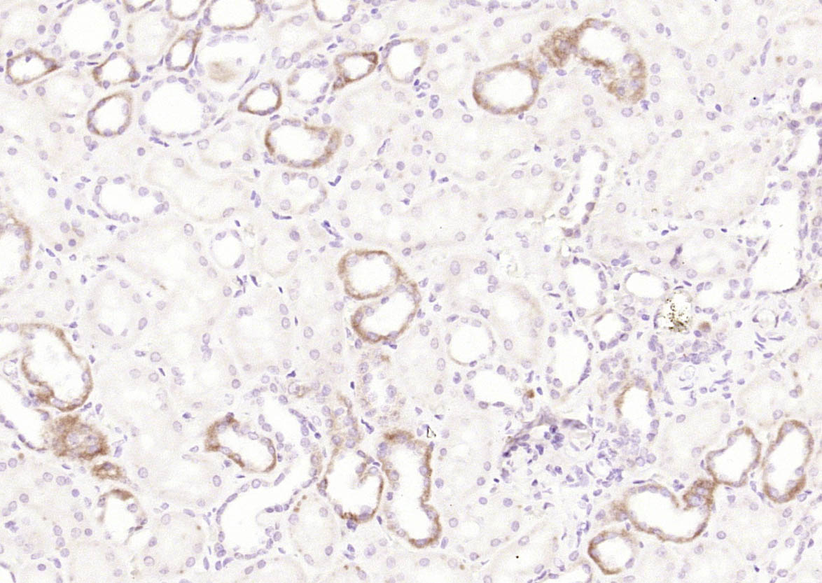 Paraformaldehyde-fixed, paraffin embedded (Human kidney); Antigen retrieval by boiling in sodium citrate buffer (pH6.0) for 15min; Block endogenous peroxidase by 3% hydrogen peroxide for 20 minutes; Blocking buffer (normal goat serum) at 37°C for 30min; Antibody incubation with (Clathrin heavy chain) Polyclonal Antibody, Unconjugated (bs-21805R) at 1:400 overnight at 4°C, followed by operating according to SP Kit(Rabbit) (sp-0023) instructionsand DAB staining.