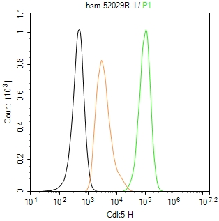 The SH-SY5Y (H) cells were fixed with 4% PFA (10 min at r.t.) and then permeabilized with 90% ice-cold methanol for 20 min at -20℃,the cells then were incubated in 5%BSA to block non-specific protein-protein interactions (30 min at r.t.), followed by secondary antibody incubation for 40 min at room temperature. Primary Antibody (green):Rabbit Anti-Cdk5 antibody (bsm-52029R,1:100); Isotype Control (orange): Rabbit IgG (bs-0295P). Blank control (black): PBS. Acquisition of 20,000 events was performed.