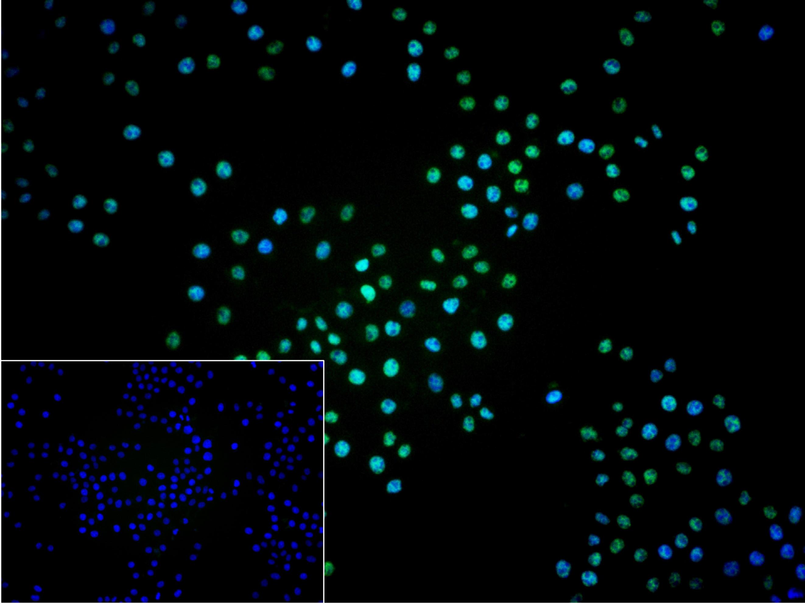 4% Paraformaldehyde-fixed Hela (H) cell; Triton X-100 at r.t. for 20 min; Antibody incubation with (CDK9) monoclonal Antibody, unconjugated (bsm-52033R) 1:100, 90 min at 37°C; followed by conjugated Goat Anti-Rabbit IgG antibody (green, bs-60295G-BF488) at 37°C for 90 min, DAPI (blue, C02-04002) was used to stain the cell nuclei. PBS instead of the primary antibody was used as the blank control.
