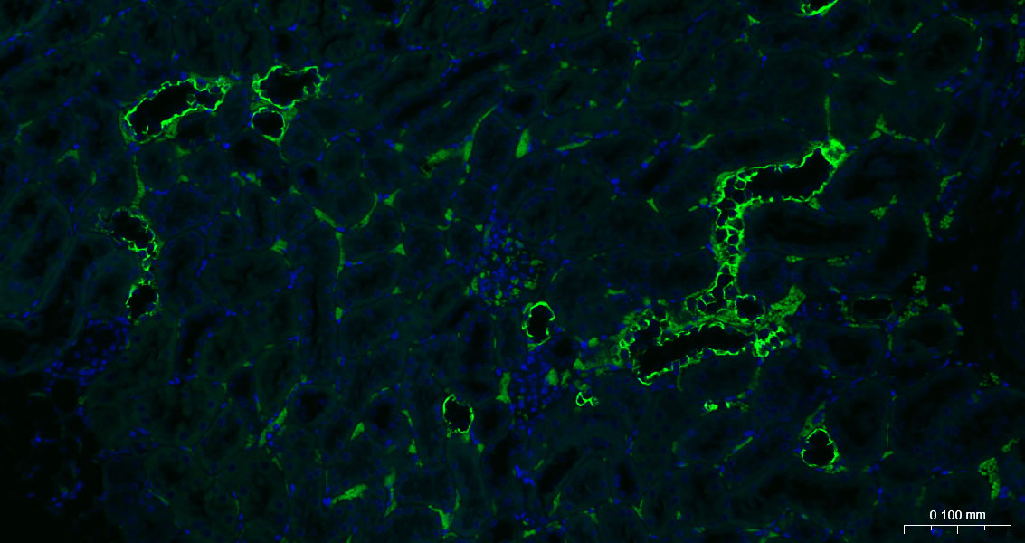 Paraformaldehyde-fixed, paraffin embedded Mouse Kidney; Antigen retrieval by boiling in sodium citrate buffer (pH6.0) for 15 min; The section was incubated with CK7 Monoclonal Antibody, Unconjugated (bsm-52065R) at 1:200 overnight at 4°C. Followed by conjugated Goat Anti-Rabbit IgG antibody (green, bs-0295G-BF488), DAPI (blue, C02-04002) was used to stain the cell nuclei.