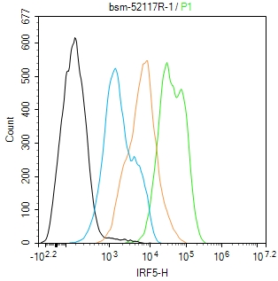 The THP-1 (H) cells were fixed with 4% PFA (10 min at r.t.) and then permeabilized with 90% ice-cold methanol for 20 min at -20℃,the cells then were incubated in 5%BSA to block non-specific protein-protein interactions (30 min at r.t.).Primary Antibody (green):Rabbit Anti-IRF5 antibody (bsm-52117R,1:100); Secondary Antibody (white blue): Goat anti-Rabbit IgG-BF488 (bs-60295G-BF488): 1 μg/test. Isotype Control (orange): Rabbit IgG (bs-0295P). Blank control (black): PBS. Acquisition of 20,000 events was performed.