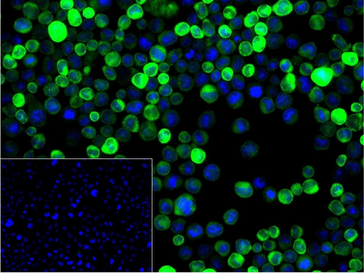 4% Paraformaldehyde-fixed MCF-7 (H) cell; Triton X-100 at r.t. for 20 min; Antibody incubation with (IRF5) monoclonal Antibody, unconjugated (bsm-52117R) 1:100, 90 min at 37°C; followed by conjugated Goat Anti-Rabbit IgG antibody (green, bs-60295G-BF488) at 37°C for 90 min, DAPI (blue, C02-04002) was used to stain the cell nuclei. PBS instead of the primary antibody was used as the blank control.