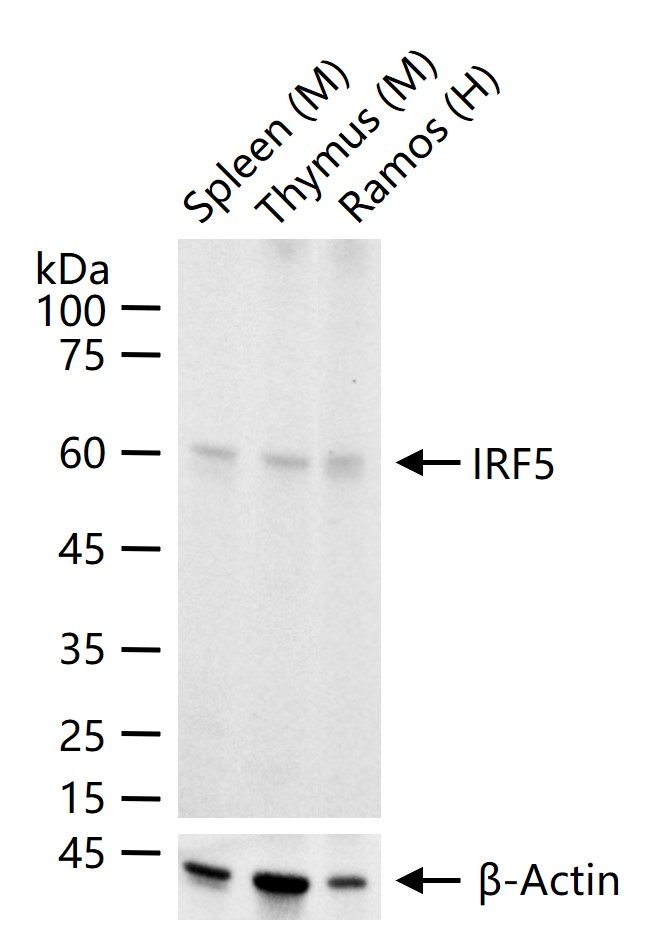 25 ug total protein per lane of various lysates (see on figure) probed with IRF5 monoclonal antibody, unconjugated (bsm-52117R) at 1:1000 dilution and 4°C overnight incubation. Followed by conjugated secondary antibody incubation at r.t. for 60 min.