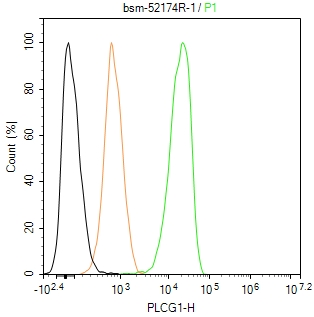 The Jurkat (H) cells were fixed with 4% PFA (10 min at r.t.) and then permeabilized with 90% ice-cold methanol for 20 min at -20℃,the cells then were incubated in 5%BSA to block non-specific protein-protein interactions (30 min at r.t.), followed by secondary antibody incubation for 40 min at room temperature. Primary Antibody (green):Rabbit Anti-PLCG1 antibody (bsm-52174R,1:100); Isotype Control (orange): Rabbit IgG (bs-0295P). Blank control (black): PBS. Acquisition of 20,000 events was performed.