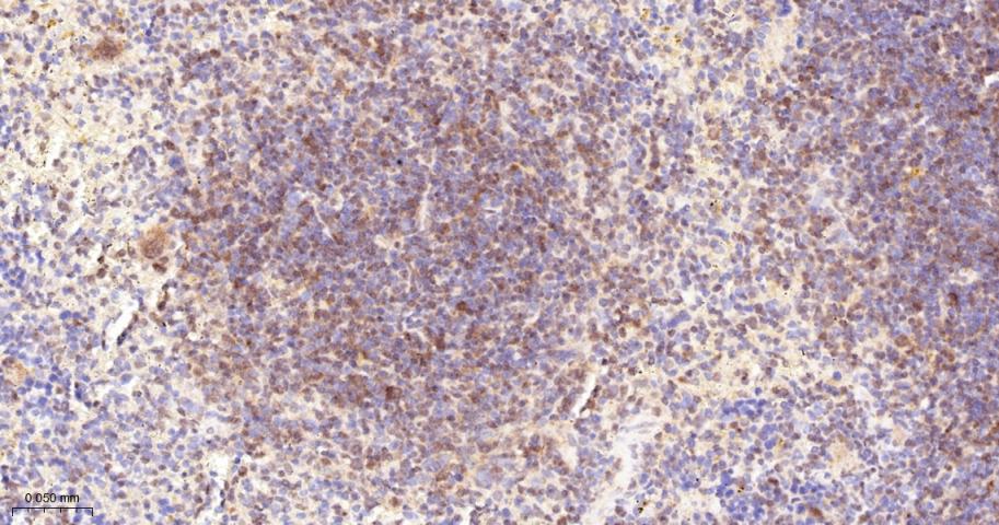 Paraformaldehyde-fixed, paraffin embedded Mouse Spleen; Antigen retrieval by boiling in sodium citrate buffer (pH6.0) for 15 min; The section was incubated with Phospho-PKC alpha (Thr638) Monoclonal Antibody, Unconjugated (bsm-52187R) at 1:200 overnight at 4°C, followed by conjugation to the bs-0295G-HRP and DAB (C-0010) staining.