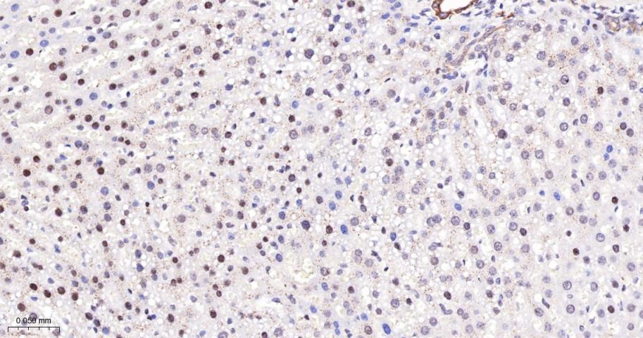 Paraformaldehyde-fixed, paraffin embedded Mouse Liver; Antigen retrieval by boiling in sodium citrate buffer (pH6.0) for 15 min; The section was incubated with Phospho-PKC alpha (Thr638) Monoclonal Antibody, Unconjugated (bsm-52187R) at 1:200 overnight at 4°C, followed by conjugation to the bs-0295G-HRP and DAB (C-0010) staining.