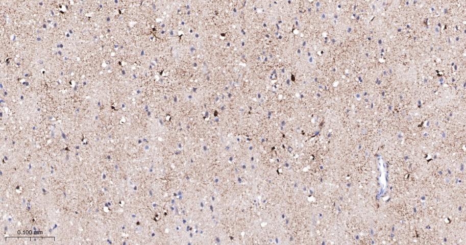Paraformaldehyde-fixed, paraffin embedded Human Cerebrum; Antigen retrieval by boiling in sodium citrate buffer (pH6.0) for 15 min; The section was incubated with Phospho-PKC alpha (Thr638) Monoclonal Antibody, Unconjugated (bsm-52187R) at 1:200 overnight at 4°C, followed by conjugation to the bs-0295G-HRP and DAB (C-0010) staining.