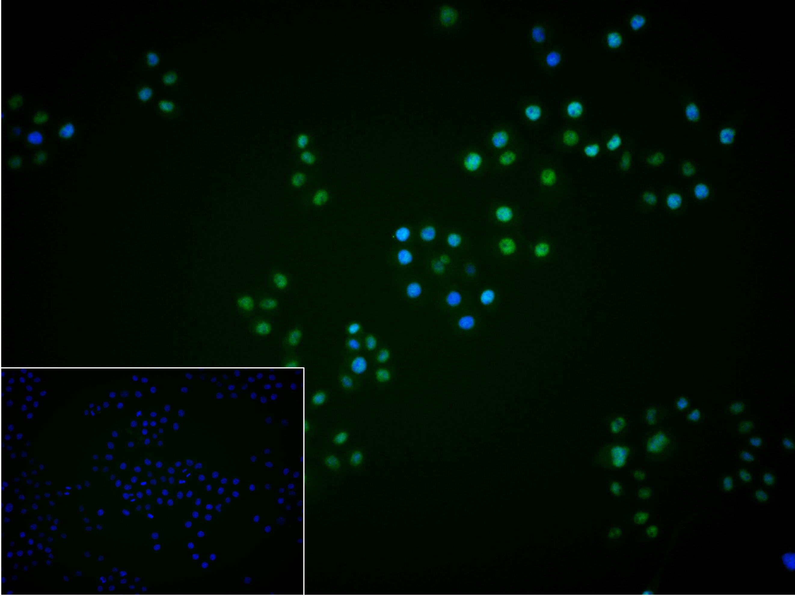 4% Paraformaldehyde-fixed Hela (H) cell; Triton X-100 at r.t. for 20 min; Antibody incubation with (YAP1) monoclonal Antibody, unconjugated (bsm-52418R) 1:100, 90 min at 37°C; followed by conjugated Goat Anti-Rabbit IgG antibody (green, bs-60295G-BF488) at 37°C for 90 min, DAPI (blue, C02-04002) was used to stain the cell nuclei. PBS instead of the primary antibody was used as the blank control.