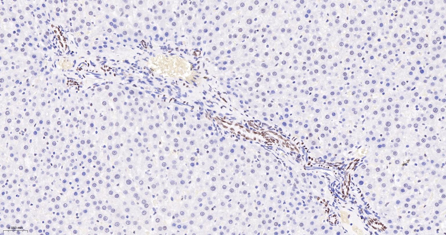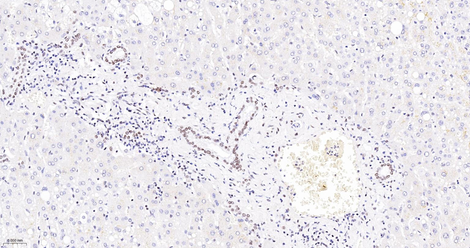 Paraformaldehyde-fixed, paraffin embedded Human Liver; Antigen retrieval by boiling in sodium citrate buffer (pH6.0) for 15 min; The section was incubated with NRF1 Monoclonal Antibody, Unconjugated (bsm-54140R) at 1:200 overnight at 4°C, followed by conjugation to the bs-0295G-HRP and DAB (C-0010) staining.