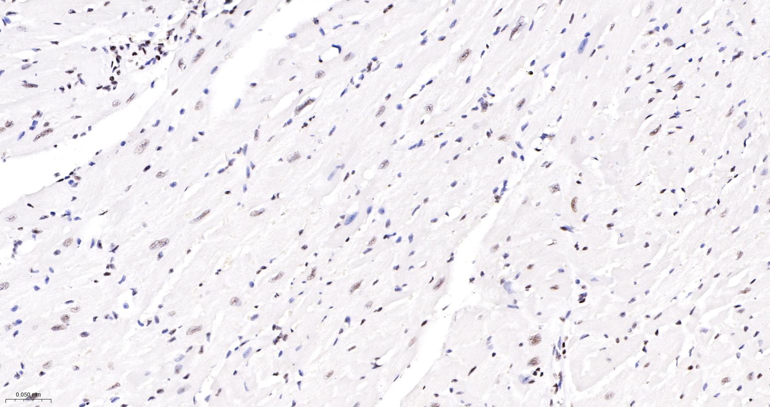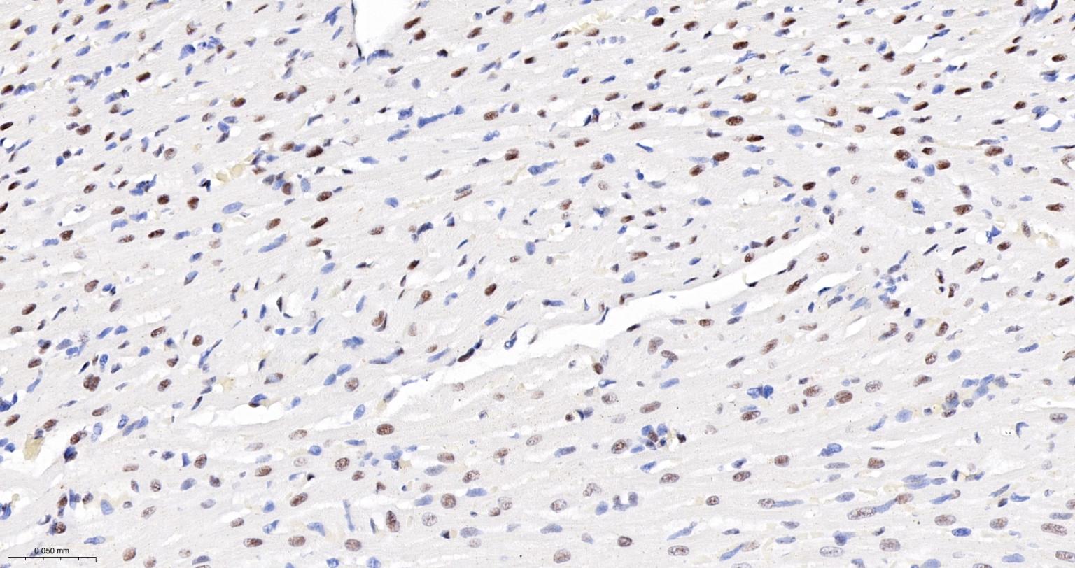 Paraformaldehyde-fixed, paraffin embedded Rat Heart; Antigen retrieval by boiling in sodium citrate buffer (pH6.0) for 15 min; The section was incubated with NRF1 Monoclonal Antibody, Unconjugated (bsm-54140R) at 1:300 overnight at 4°C, followed by conjugation to the bs-0295G-HRP and DAB (C-0010) staining.