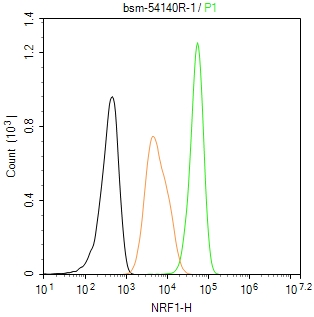 The Hela (H) cells were fixed with 4% PFA (10 min at r.t.) and then permeabilized with 90% ice-cold methanol for 20 min at -20℃,the cells then were incubated in 5%BSA to block non-specific protein-protein interactions (30 min at r.t.), followed by secondary antibody incubation for 40 min at room temperature. Primary Antibody (green):Rabbit Anti-NRF1 antibody (bsm-54140R,1:100); Isotype Control (orange): Rabbit IgG (bs-0295P). Blank control (black): PBS. Acquisition of 20,000 events was performed.