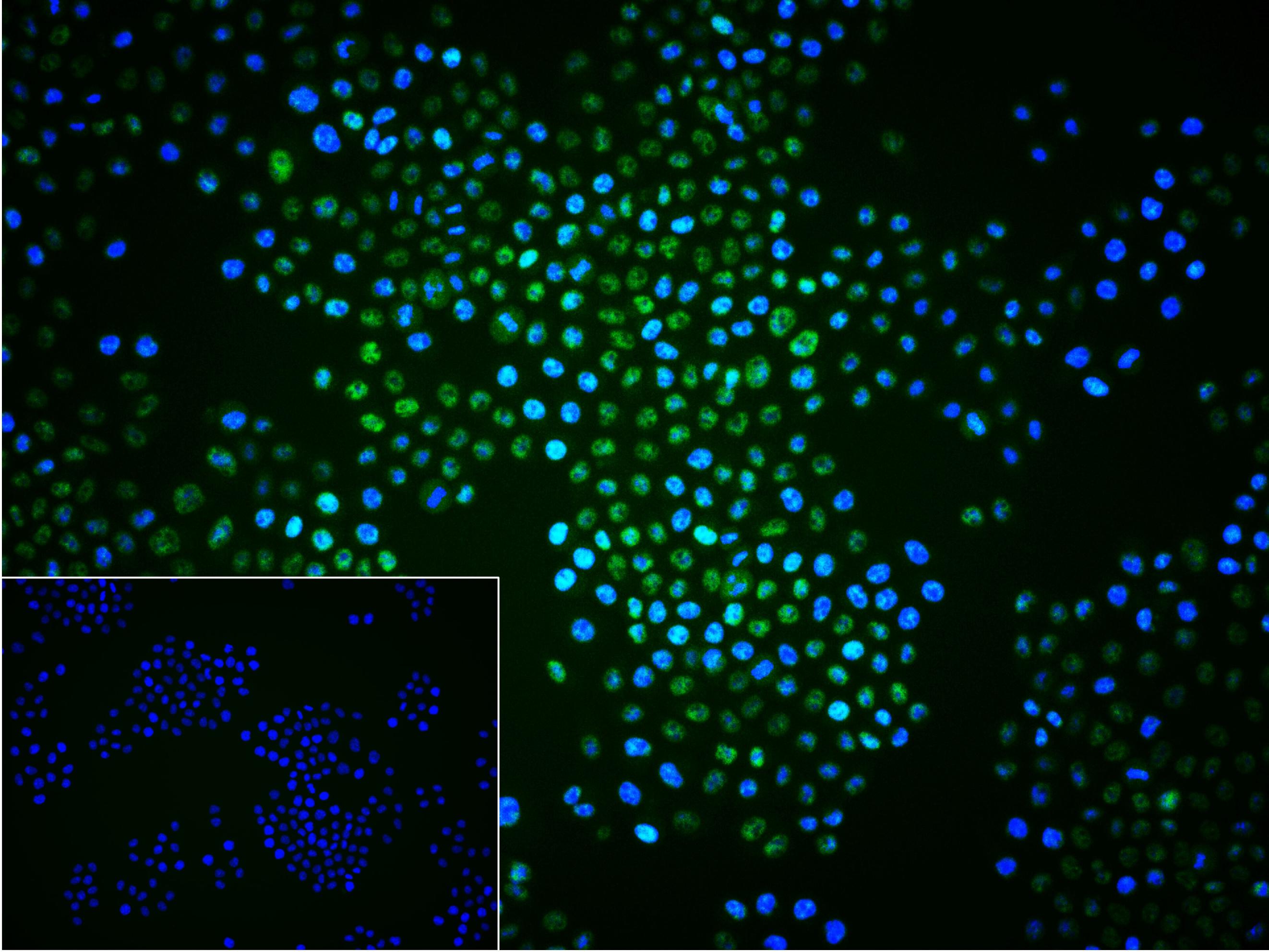 4% Paraformaldehyde-fixed Hela (H) cell; Triton X-100 at r.t. for 20 min; Antibody incubation with (NRF1) monoclonal Antibody, unconjugated (bsm-54140R) 1:100, 90 min at 37°C; followed by conjugated Goat Anti-Rabbit IgG antibody (green, bs-60295G-BF488) at 37°C for 90 min, DAPI (blue, C02-04002) was used to stain the cell nuclei. PBS instead of the primary antibody was used as the blank control.
