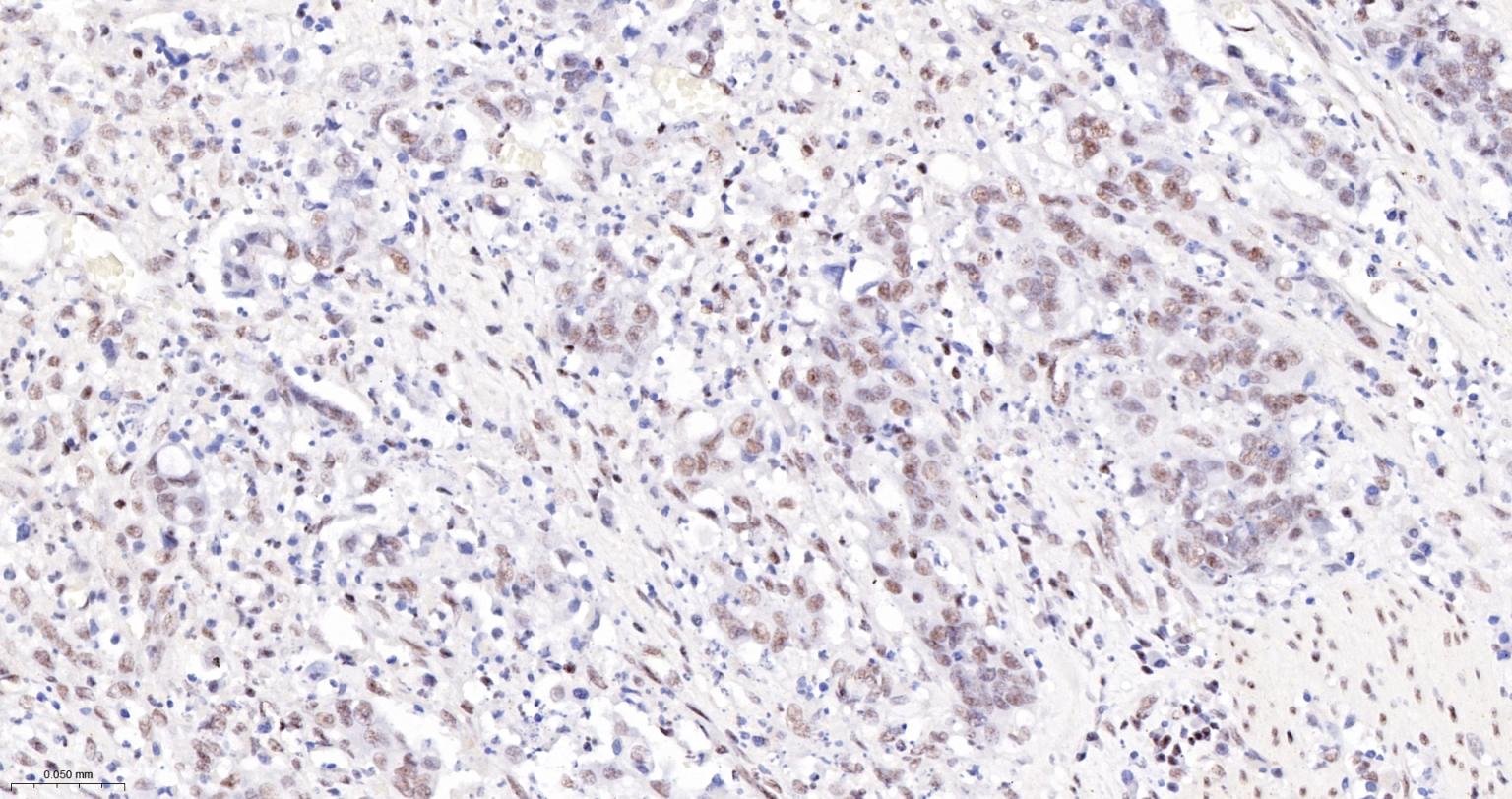 Paraformaldehyde-fixed, paraffin embedded Human Gastric Cancer; Antigen retrieval by boiling in sodium citrate buffer (pH6.0) for 15 min; The section was incubated with NRF1 Monoclonal Antibody, Unconjugated (bsm-54140R) at 1:200 overnight at 4°C, followed by conjugation to the bs-0295G-HRP and DAB (C-0010) staining.