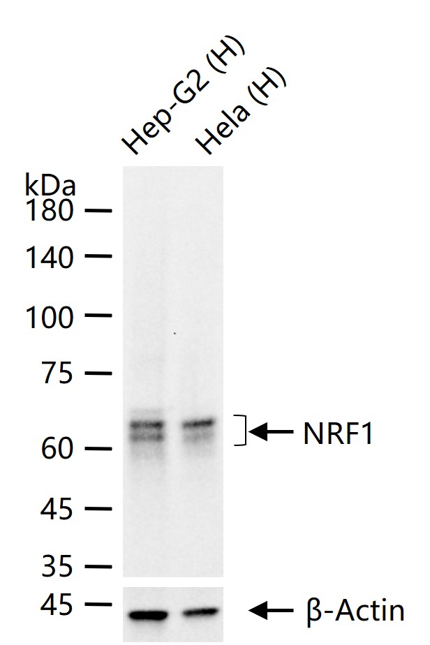 25 ug total protein per lane of various lysates (see on figure) probed with NRF1 monoclonal antibody, unconjugated (bsm-54140R) at 1:1000 dilution and 4°C overnight incubation. Followed by conjugated secondary antibody incubation at r.t. for 60 min.